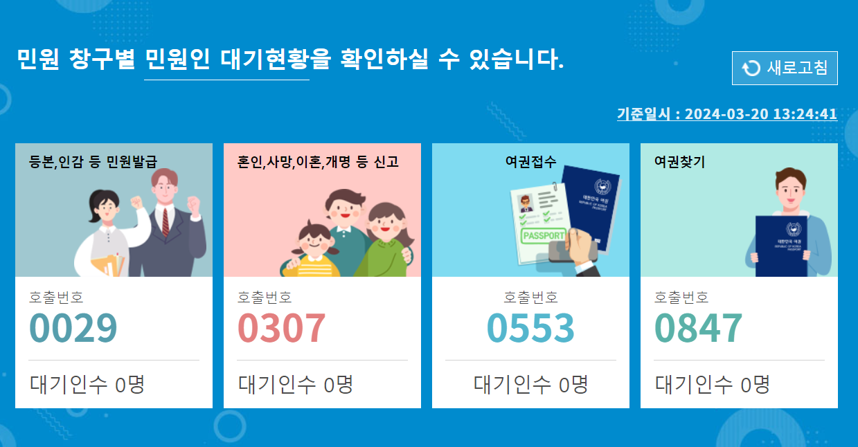 아래 링크 가시면 위 그림과 같이 광진구청 홈페이지로 이동하여 여권 민원 대기현황 확인 가능하니 참조하시기 바랍니다.