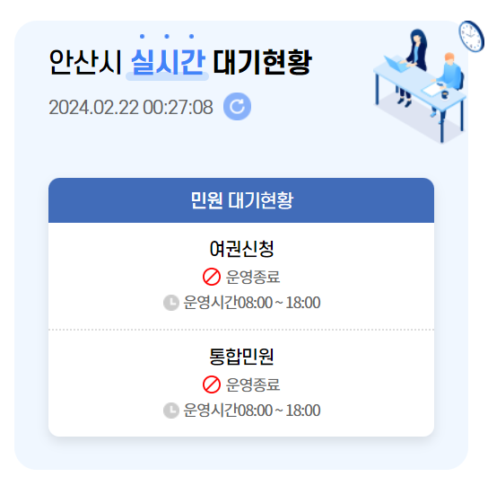 아래 링크 가시면 위 그림과 같이 안산시청 홈페이지로 이동하여 여권 민원 대기현황 확인 가능하니 참조하시기 바랍니다.